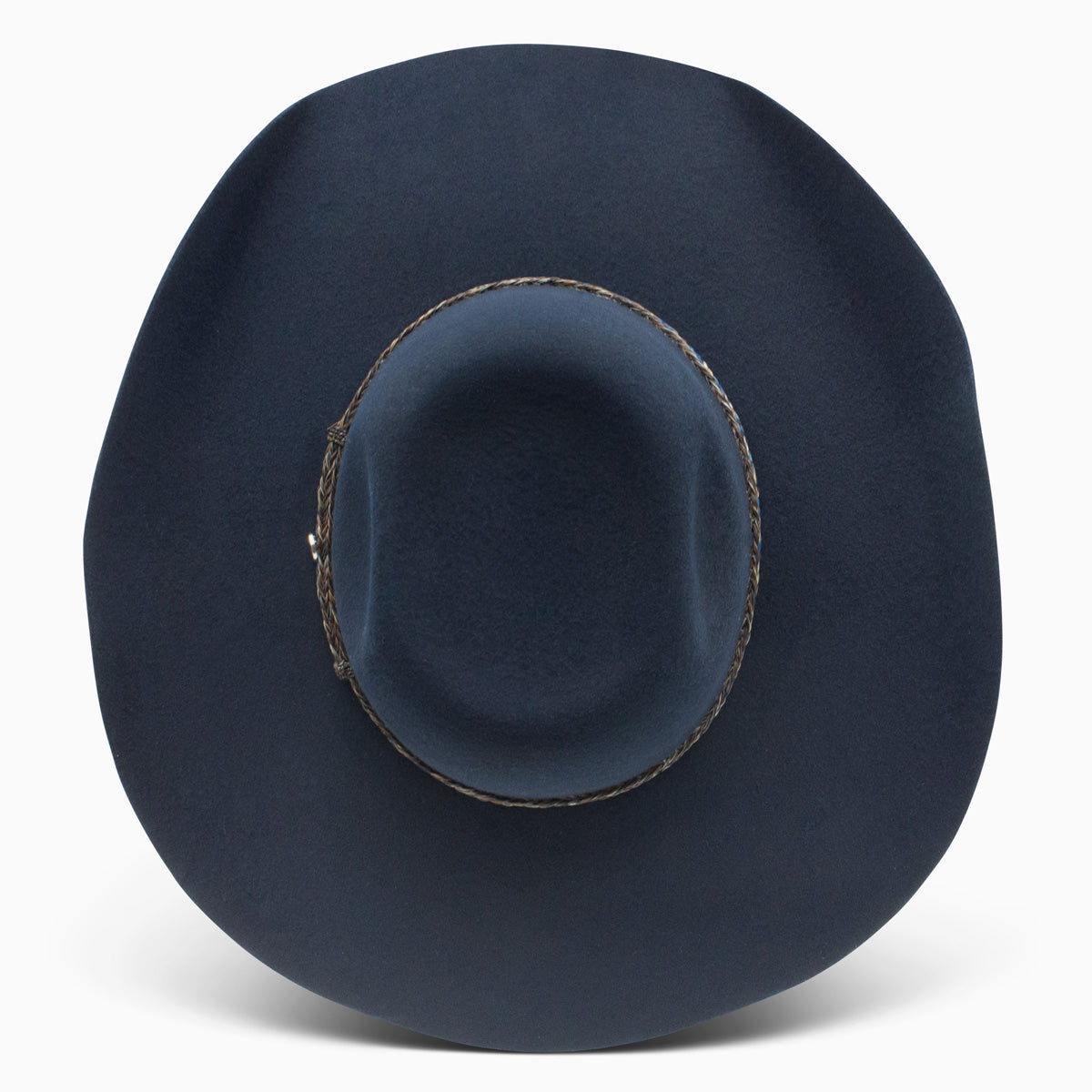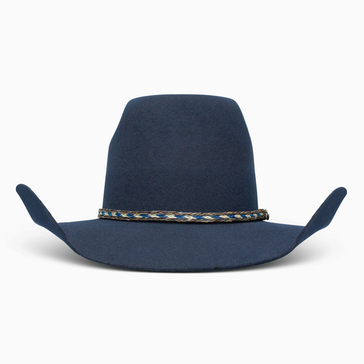 Go on an adventure with The Hooey Trip by Resistol. This premium wool cowboy hat features a striking navy blue color that commands attention. The 5 ¼” crown and wide brim offer classic Western style with modern flair. What sets The Trip apart is its unique hatband - a beautifully braided horsehair design in earthy tones accented with pops of turquoise blue. A sleek Hooey concho adorns the band, adding an extra touch of distinction. Inside, you'll find Resistol's commitment to quality with a comfortable cloth sweatband. The 100% wool construction provides durability and shape retention for years of wear.