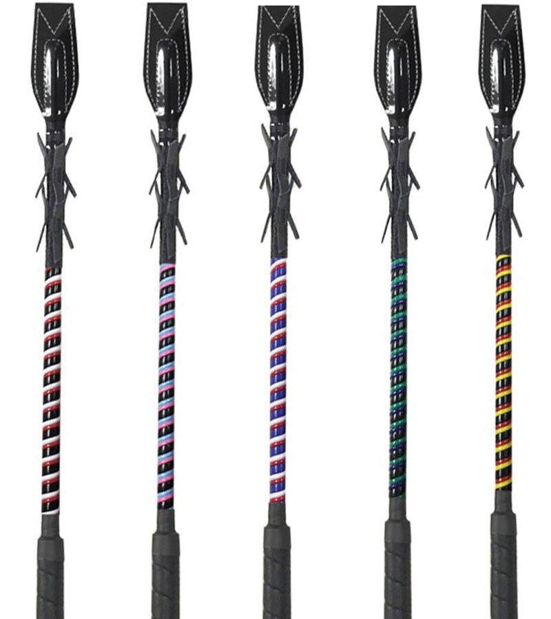 Golf style grip and fiberglass shaft with thick leather curved flapper and feathers.