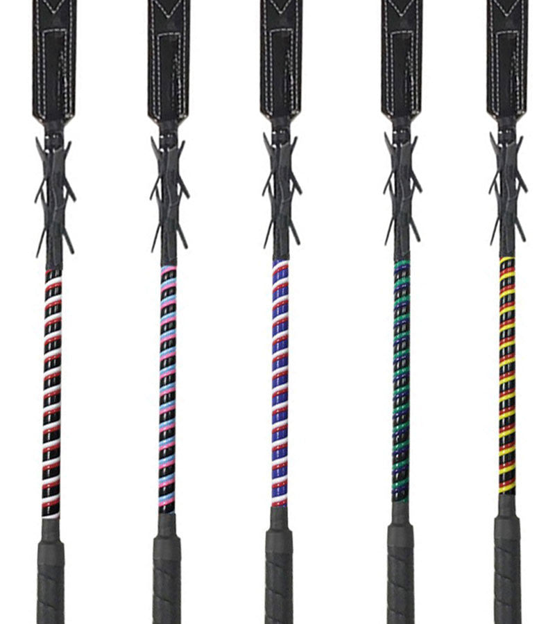 Racing Bat with golf style grip and fiberglass shaft with thick leather rectangle flapper and feathers.