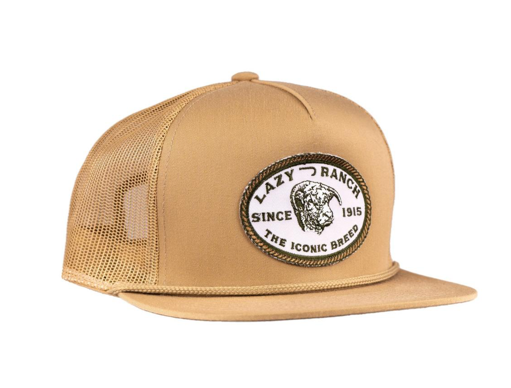 Introducing the Lazy J Ranch Tan Olive Iconic Breed Patch Classic Rope Trucker Hat. This hat is perfect for those who live and breathe the western lifestyle, with a nod to the timeless tradition of Hereford breed cattle that have been at the heart of ranching for generations.