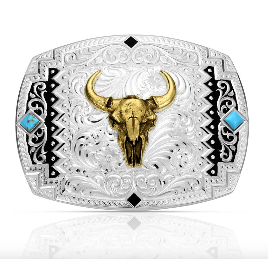Powerful, iconic, and deeply connected to the land. TheSouthwest Scroll Buckle with Buffalo Skull centers around a bold buffalo head, an enduring symbol of strength and resilience. Every detail honors the rugged beauty of the west, making this buckle a true statement piece for those who carry the West in their soul. Standard 1.5 inch belt swivel. Stone color may vary.