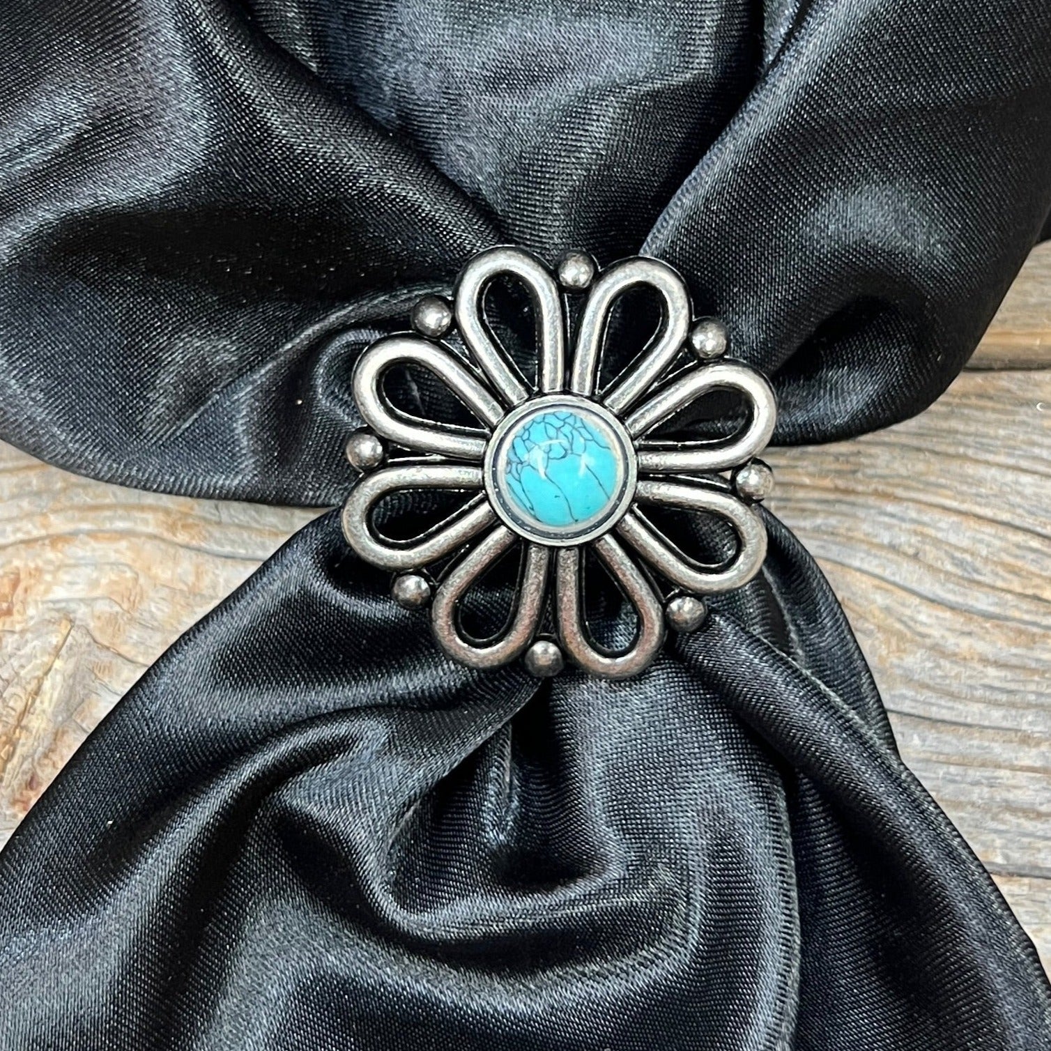 Antique Silver western concho with a flower design and turquoise colored center stone western concho slide(W231).