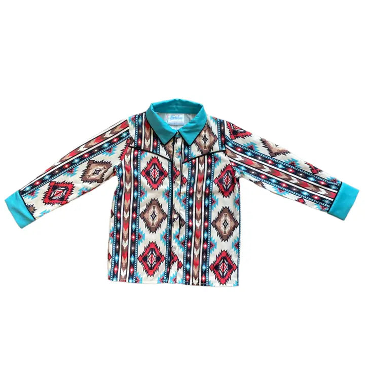 Multi Color Aztec Print Long Sleeve Snap Front Shirt.