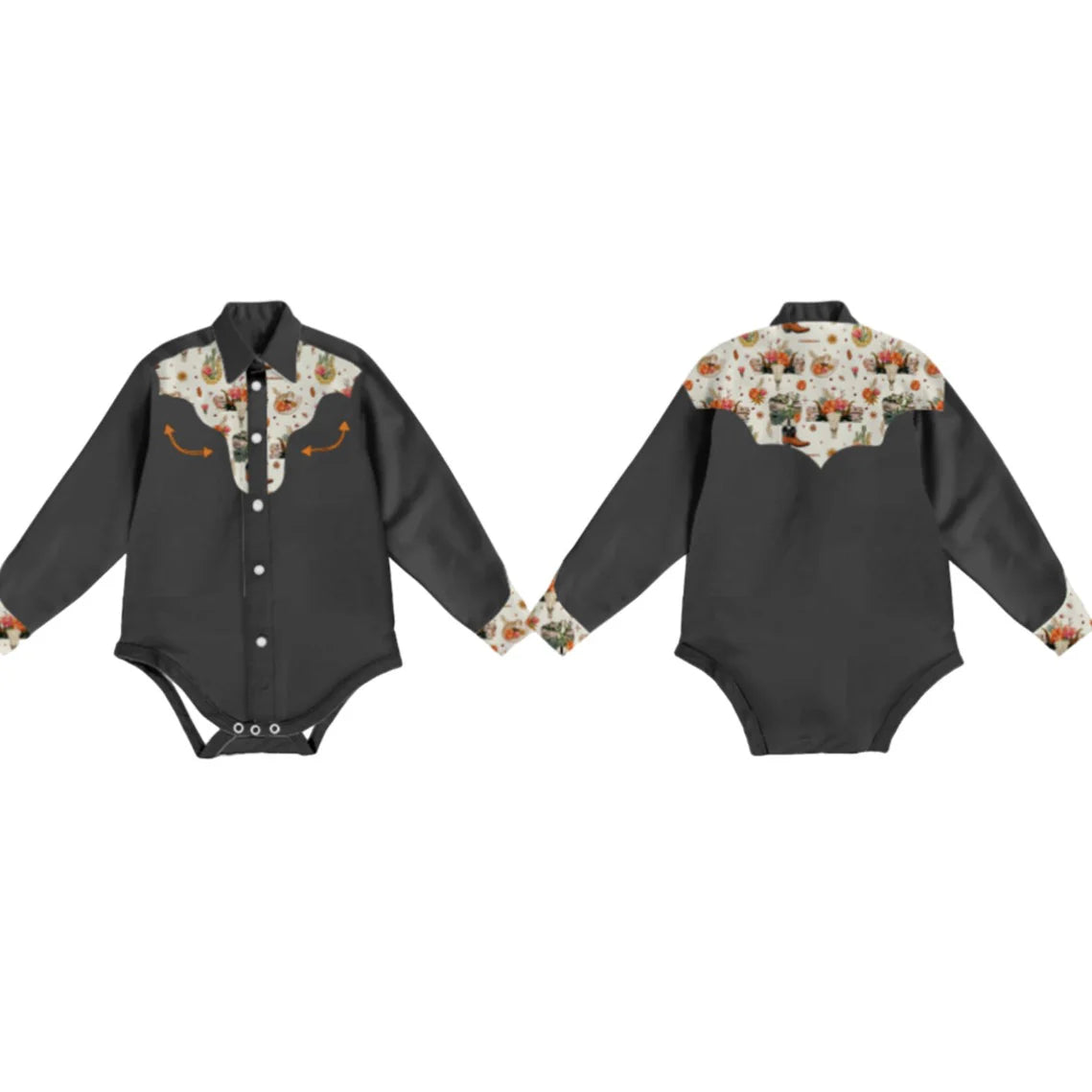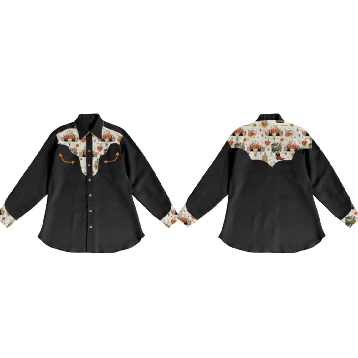 Black with Vintage Western Print Yokes Long Sleeve Snap Front Shirt.