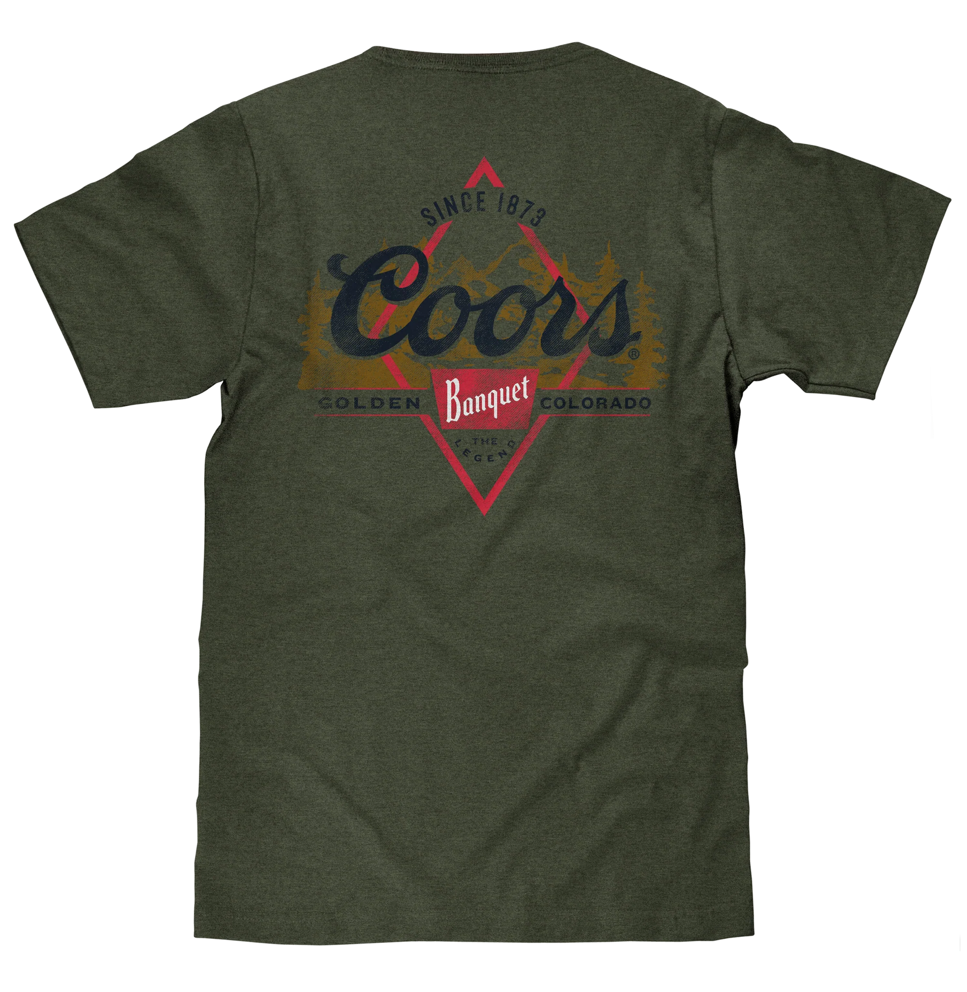 We wanted to bring some of that heritage to you, so our team crafted a comfy double-sided nature inspired t-shirt that's fit for any loyal fan. This beer shirt features the Coors Banquet logo on the front left chest. For the back, we've selected a larger version of the Coors Banquet logo on a subtle forest background, along with "Since 1873", "Golden Colorado" and "The Legend" text.