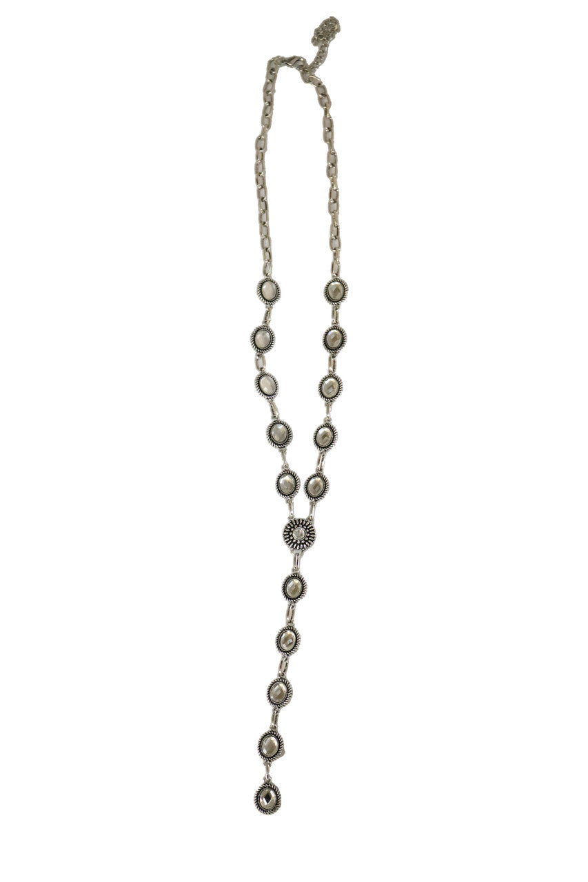 Dainty Silver Oval Rhinestone Concho Lariat Style Necklace.