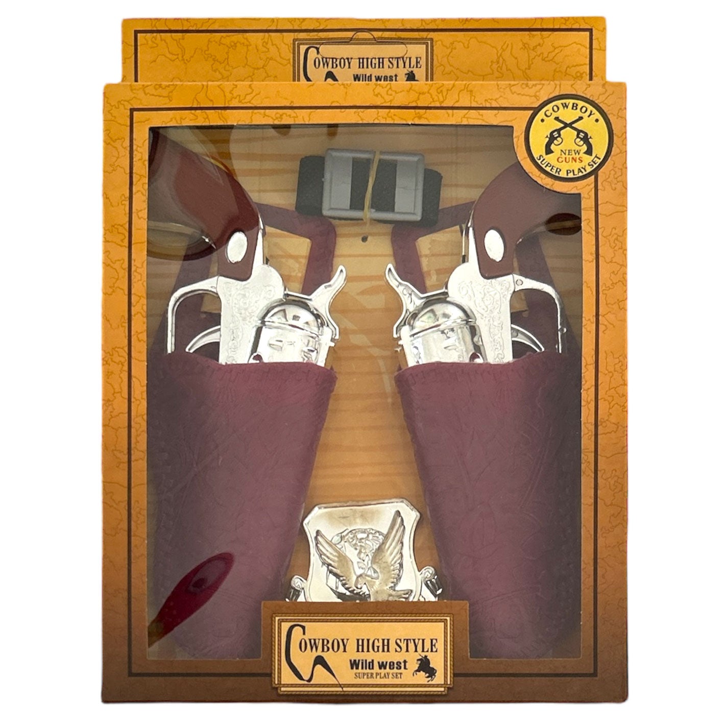 Toy cowboy gun set with 2 pistols, brown handles, brown embossed holsters, and Silver eagle shield